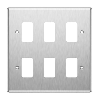 Upgrade your home or office with our 6 Module Grid Plate in Brushed Chrome, designed to offer a sleek and modern look while accommodating various module configurations. This grid plate allows for the flexible integration of switches, sockets, and other functional elements in a single, streamlined unit. Its brushed chrome finish not only adds a touch of sophistication but also provides durability and resistance to fingerprints and smudges.