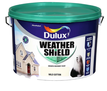 Dulux Weathershield is one of the most trusted brands in Ireland for masonry and exterior paints. Dulux exterior paints have been in business for over 60 years and have modified their paints specifically for the unique and often abrasive Irish weather.This paint incorporates acrylic technology to provide a fresher paint look for longer. Protects your home from unwanted plant growth, fungicide and algicide and other surface growth. Dulux Weathershield Smooth Masonry is also available in 5 &10 Litre and in a colour range.